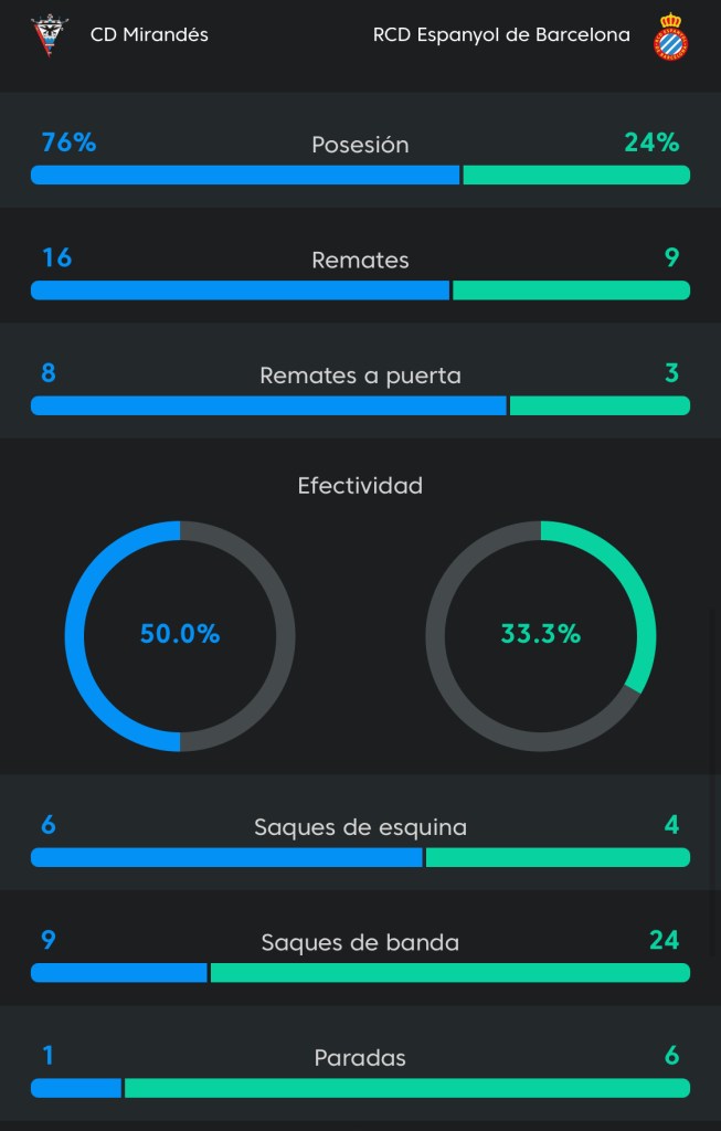 Esa superioridad económica no se plasmó en absoluto en el césped. Peor aún, el Mirandés fue el equipo que más mereció llevarse los 3 puntos aunque Vicente Moreno lo viera de forma distinta («Hemos intentado ir a por la victoria. Y cuando vas de forma descarada a por la victoria, el rival se puede aprovechar como en la acción del segundo gol»).